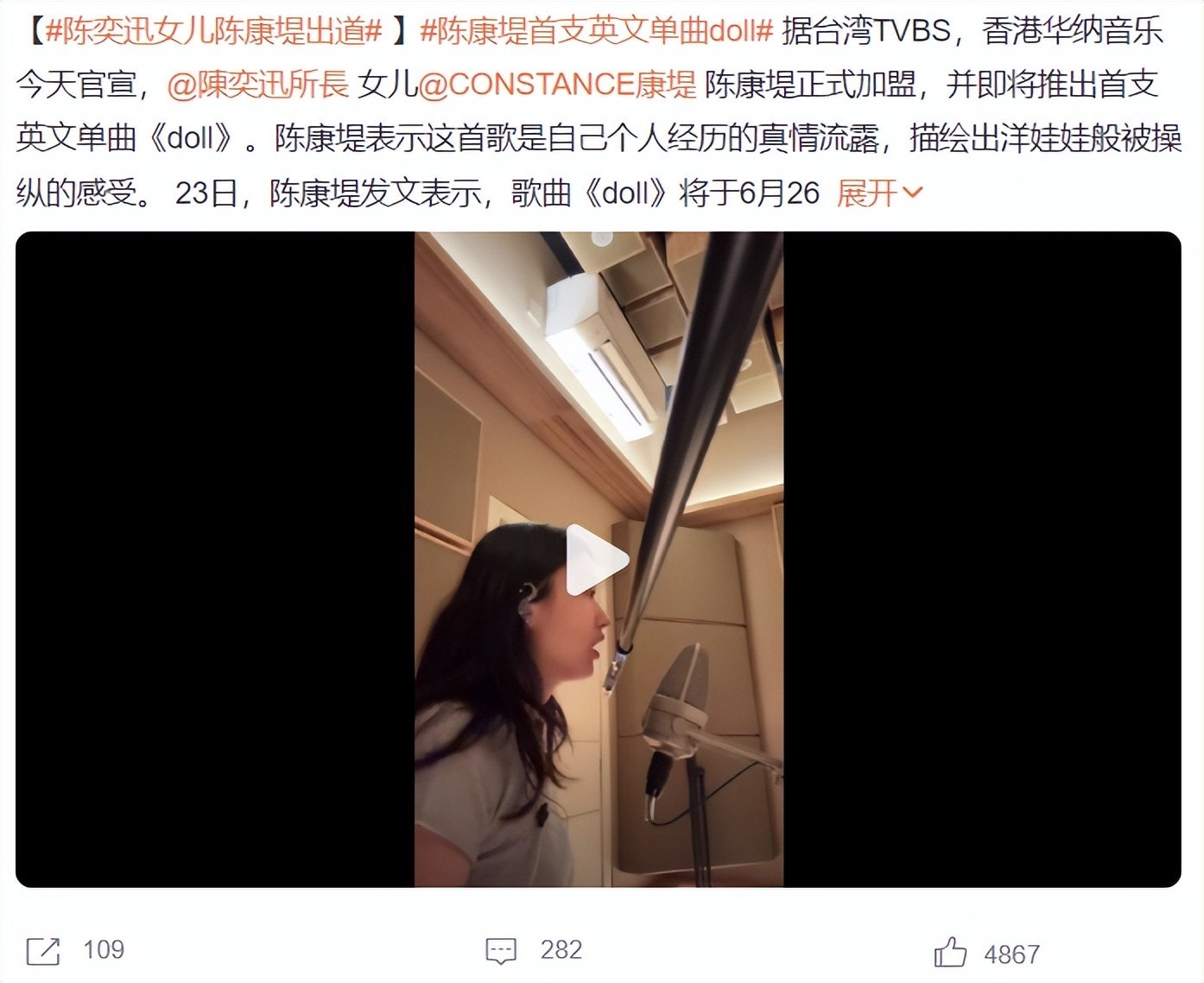 当沈佳润成功出道后,网友们发现,还有一位星二代准备出道,这位星二代就是“陈康堤”,听到这个名字后,很多网友都忍不住问:她是谁?其实,她是陈奕迅和徐濠萦的女儿。