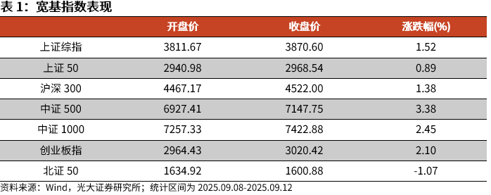 本周上证综指上涨0.87%,上证50上涨1.48%,沪深300上涨2.03%,中证500上涨2.38%,中证1000上涨0.92%,创业板指上涨4.68%,北证50指数下跌1.32%。