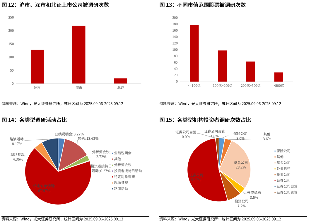从调研类型来看,特定对象调研和其他为本周主要调研类型,占比分别为73.08%和11.92%。从机构类型来看,投资公司、基金公司和证券公司的调研次数占比依次为7.7%、27.7%和52.0%。