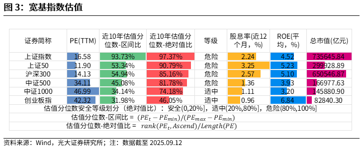 截至2025年9月26日,宽基指数来看,上证指数、上证50、沪深300和中证500指数处于估值分位数“危险”等级,中证1000和创业板指处于估值分位数“适中”等级。