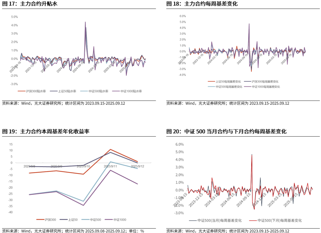 本周沪深300、上证50、中证500和中证1000指数期货主力合约贴水率环比上一交易周下降。IF当月合约近一季度平均每周基差变化-0.02%,相比于近半年的-0.01%环境变差。IH当月合约近一季度平均每周基差变化0.01%,相比于近半年的0.00%环境变好。IC当月合约近一季度平均每周基差变化-0.05%,相比于近半年的-0.02%环境变差。
