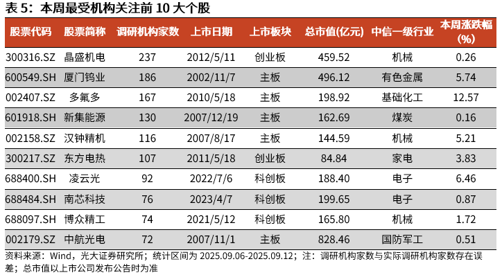本周受到机构关注程度最高的前5大个股依次为晶盛机电(237家)、厦门钨业(186家)、多氟多(167家)、新集能源(139家)和汉钟精机(116家)。