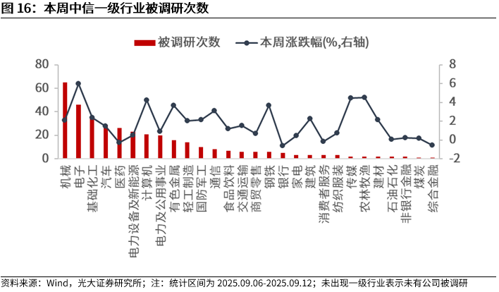从中信一级行业来看,本周机械、计算机和基础化工行业被调研次数较多,本周涨跌幅依次为0.03%、-0.31%和-0.14%。