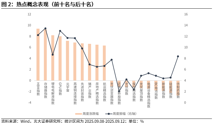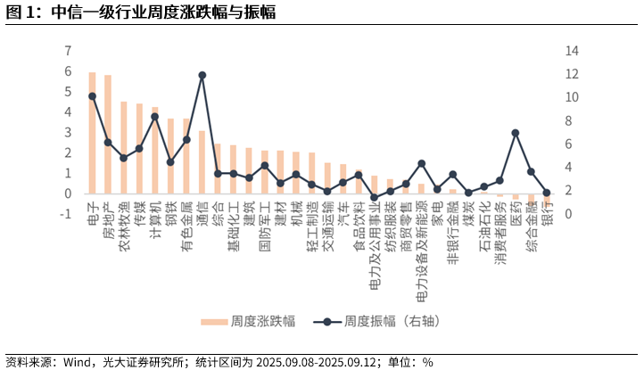 从中信一级行业来看,本周涨幅较高的行业为电子、有色金属、电力设备及新能源、电力及公用事业、传媒;表现较差的行业为消费者服务、商贸零售、轻工制造、纺织服装、食品饮料。中信一级行业中振幅最高的前5大行业依次为电力设备及新能源、传媒、电子、有色金属、计算机。