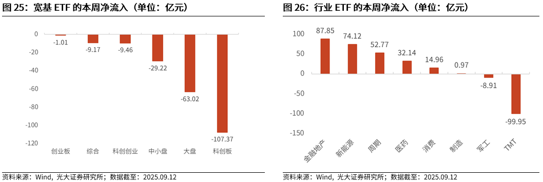 本周(2025.09.22-2025.09.26,下同),A股震荡上行,行业表现分化明显——电子、有色金属、电力设备及新能源领涨主要行业,消费者服务、商贸零售表现垫后。量能指标方面,市场上行背景下、量能指标再度收缩,截至周五(2025.09.26)主要宽基指数量能择时指标维持谨慎观点。资金面方面,两融资金、ETF资金表现仍积极——融资增加额维持净增加、ETF资金延续净流入。