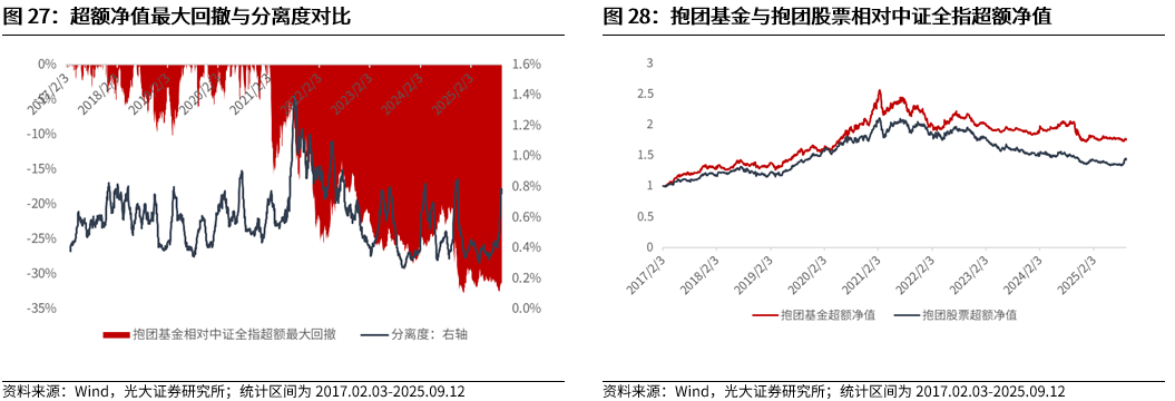 构造抱团基金组合可以帮助我们实时监控基金抱团程度。具体来说,我们通过分离度指标作为基金抱团程度的代理变量。具体计算方式为抱团基金截面收益的标准差,如果抱团基金组合的截面收益标准差小,说明抱团基金表现趋同,抱团程度高,反之表示抱团正在瓦解。