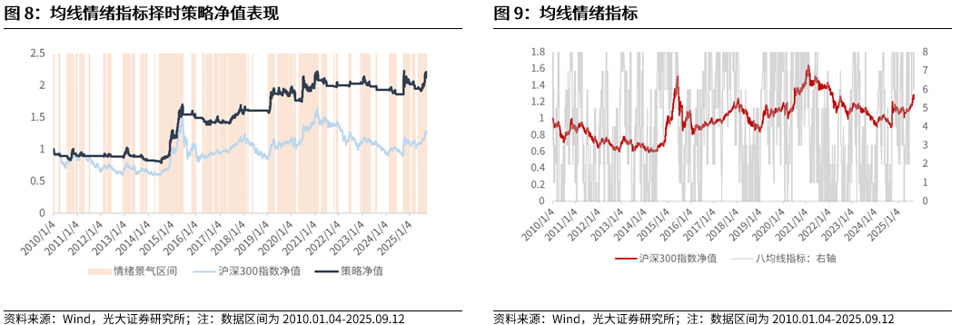 从均线情绪指标来看,短期内沪深300指数处于情绪景气区间。