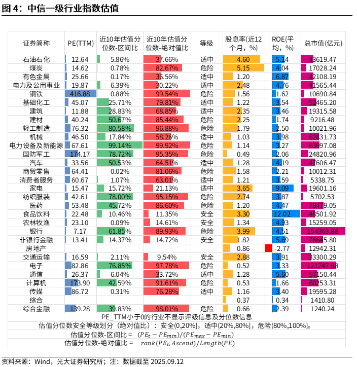 中信一级行业分类来看,煤炭、钢铁、建材、轻工制造、电力设备及新能源、国防军工、纺织服装、医药、银行、电子、计算机、综合金融处于估值分位数“危险”等级;食品饮料、农林牧渔、非银行金融、交通运输处于估值分位数“安全”等级。