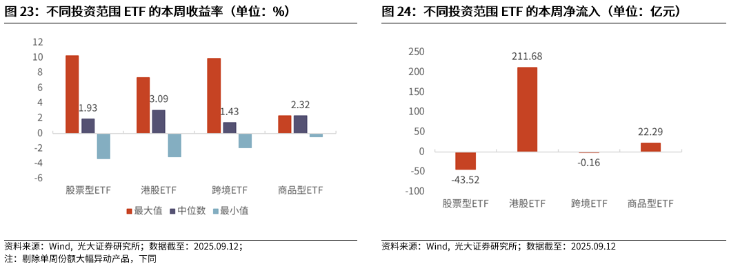 股票型ETF本周收益中位数为0.94%,资金净流入364.66亿元。跨境ETF本周收益中位数为-0.80%,资金净流入16.31亿元。港股ETF本周收益中位数为-1.89%,资金净流入83.95亿元。商品型ETF本周收益中位数为3.17%,资金净流入30.38亿元。