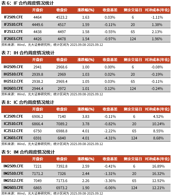 本周IF当月合约上涨1.07%,收于4543.2,收盘基差-0.15%;IH当月合约上涨0.95%,收于2945.2,收盘基差0.14%;IC当月合约上涨1.19%,收于7202.6,收盘基差-0.53%;IM当月合约下跌0.05%,收于7357,收盘基差-0.55%。